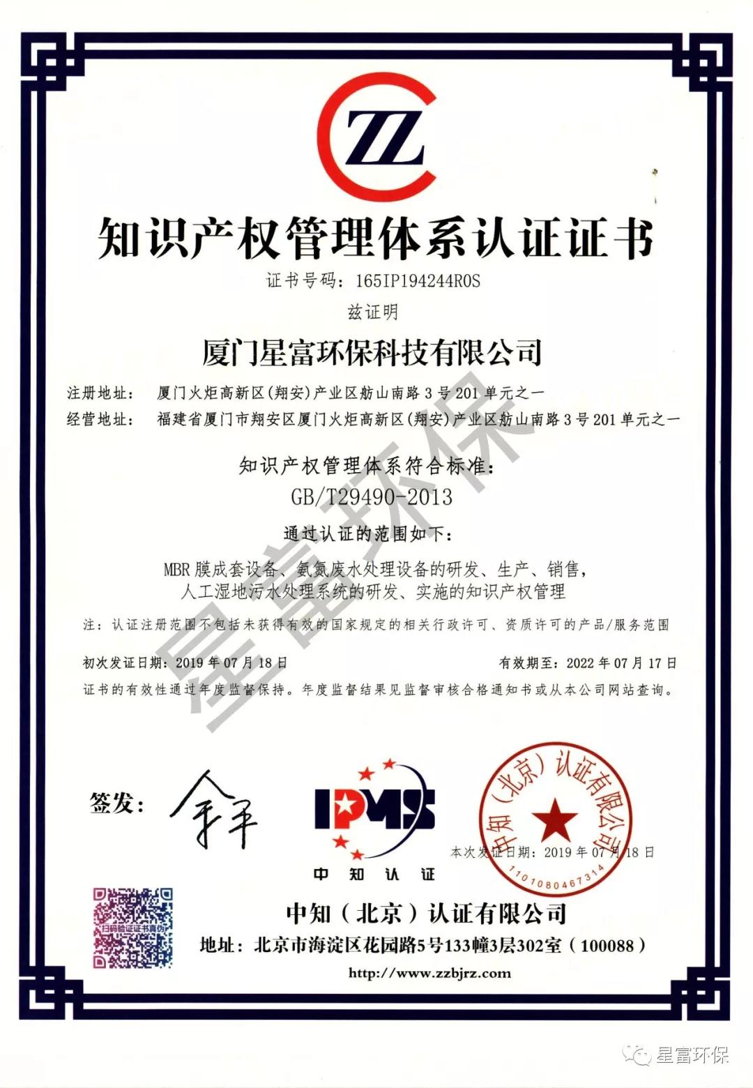 2019年07月18日,收到由中知(北京)認(rèn)證有限公司頒發(fā)的《知識產(chǎn)權(quán)管理體系認(rèn)證證書》,這意味著星富環(huán)保在知識產(chǎn)權(quán)領(lǐng)域獲得到重要認(rèn)可,在知識產(chǎn)權(quán)方面得到進(jìn)一步規(guī)范和在綜合競爭力得到進(jìn)一步提升。